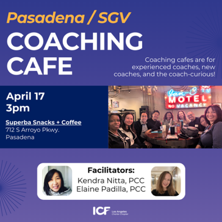 REGISTER NOW! Pasadena / San Gabriel Valley Coaching Cafe Facilitators: Kendra Nitta, PCC, and Elaine Padilla, PCC Date: Friday, April 17, 2026 Time: 3:00 pm - 4:30 pm Pacific Time Whether you are an experienced coach, just launching your practice or coach curious, a Coaching Cafe is for YOU! Attending a Cafe is an informal opportunity to build relationships and share ideas.