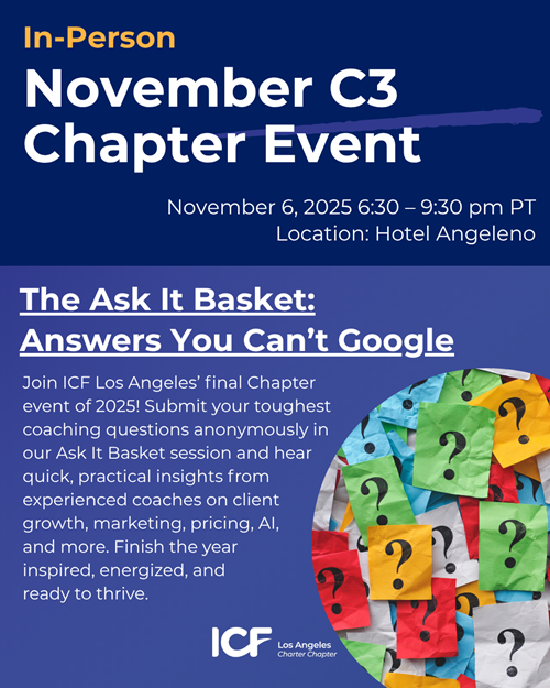Get ready to unleash your creativity, share your brilliant ideas, and connect with other members. Hosted by Karyn Ezell, Executive Coach and ICFLA Director of Membership, this is your chance to connect with fellow ICF Los Angeles members, ask burning questions, provide valuable feedback, and, of course, network like a pro.