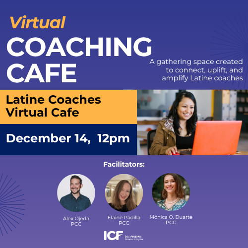 The ICF Los Angeles and ICF San Francisco Bay Area chapters are partnering to launch this Virtual Café, a gathering space created to connect, uplift, and amplify Latine coaches by centering their lived experiences, cultural perspectives, and professional journeys. This member resource group is designed to foster shared learning, meaningful dialogue, and community‑building so as to strengthen networks and belonging while welcoming anyone who wishes to learn alongside us..